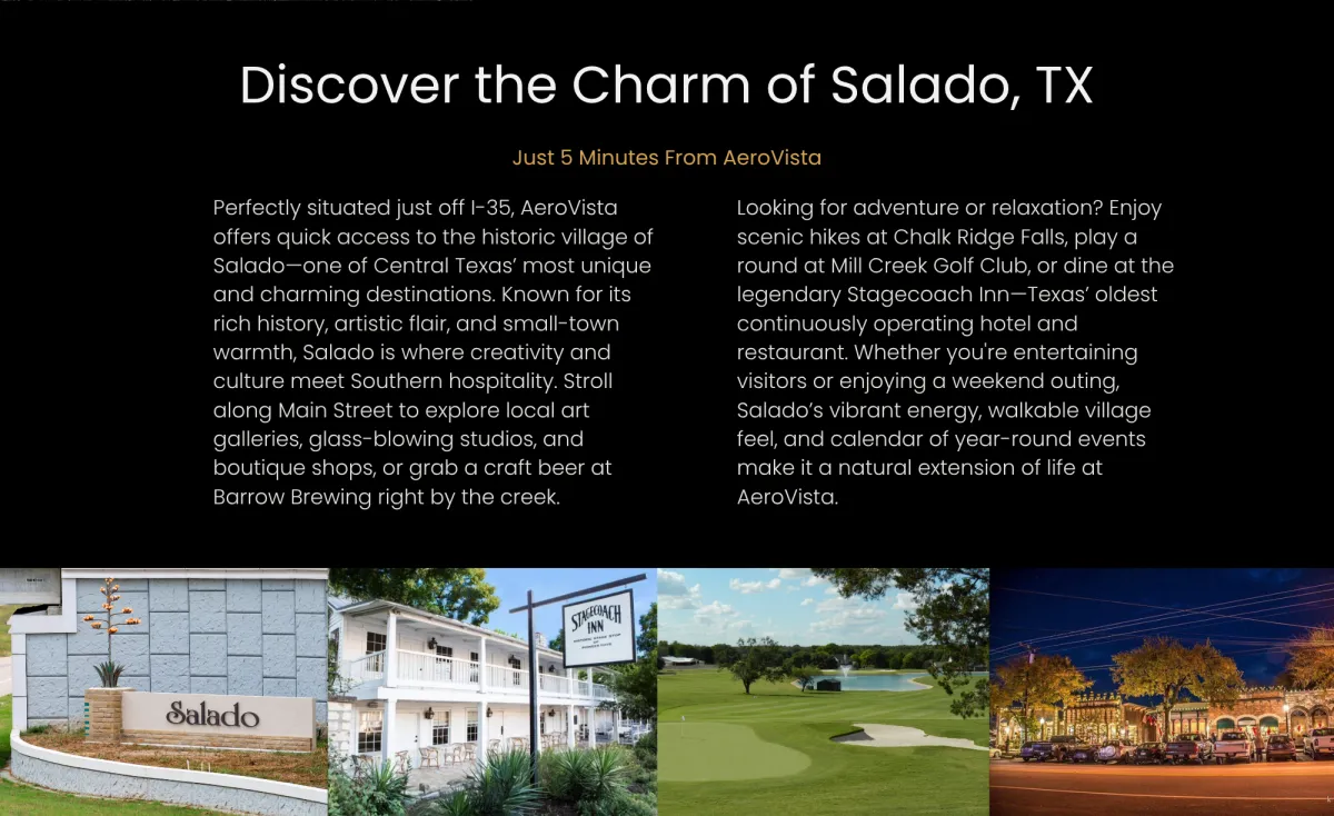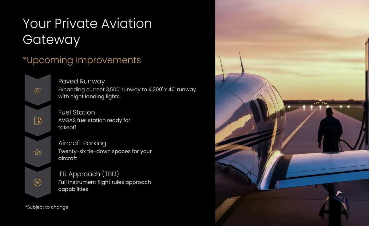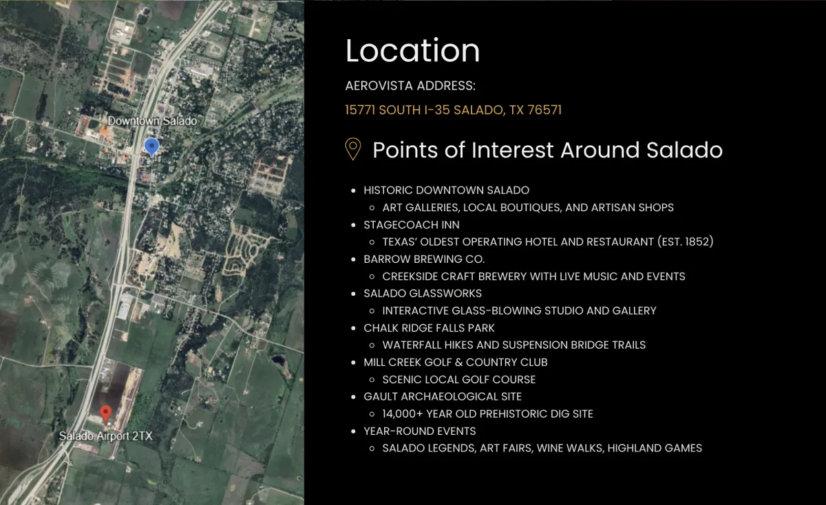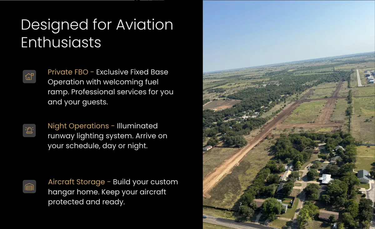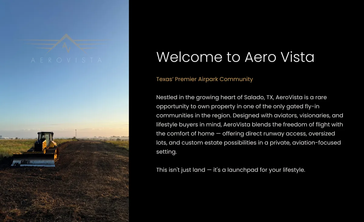 Private aviation community with direct runway access — minutes from Austin, TX. AeroVista is where the freedom of flight meets the luxury of home.