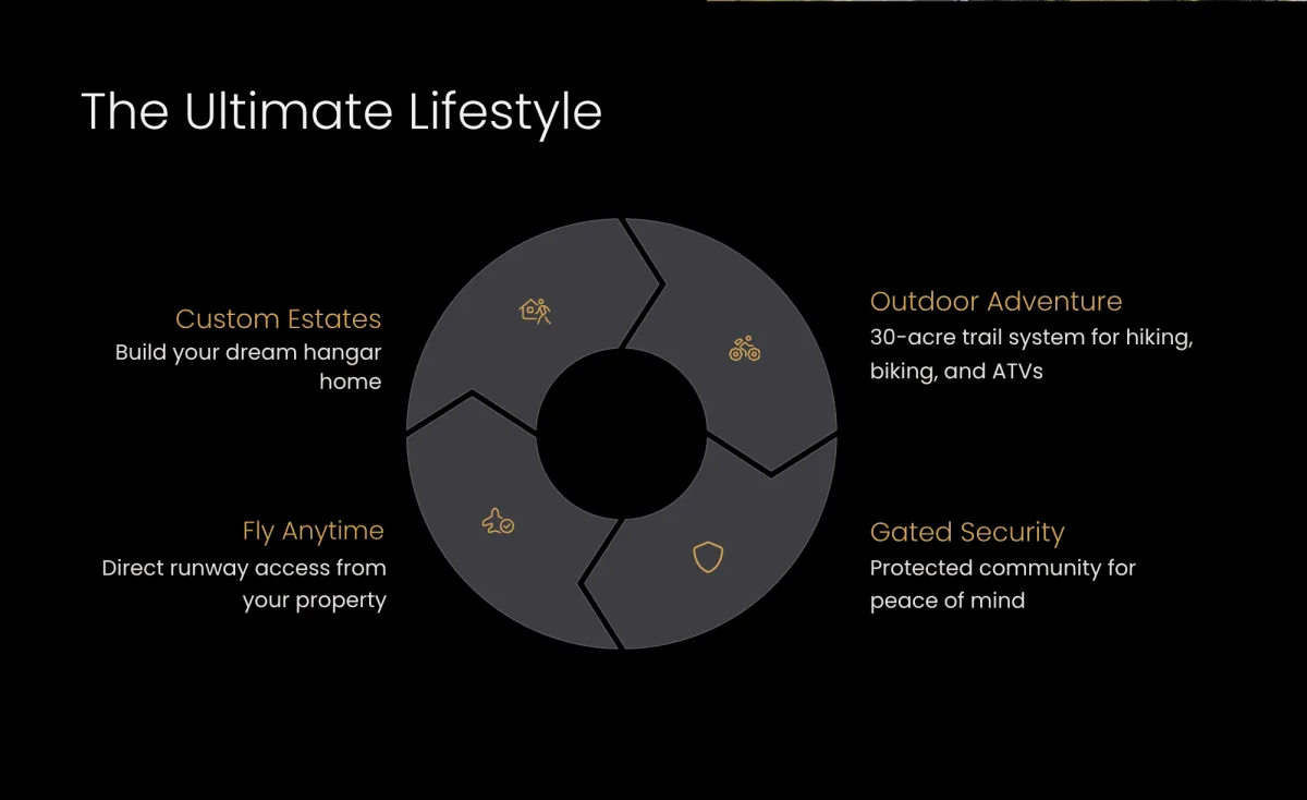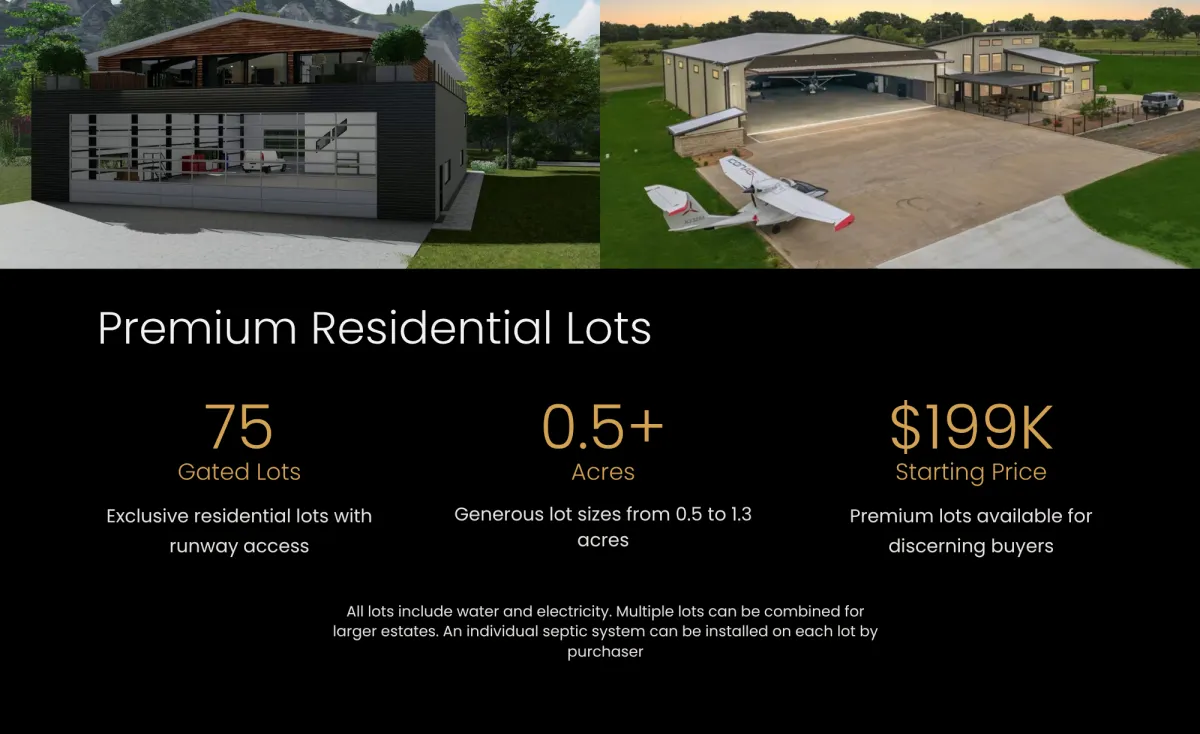 You are purchasing the real estate ownership of a residential lot within a private, gated aviation community, not a lease or membership. Each lot includes access to taxiways and the runway, allowing you to build your own custom hangar home and live with direct aviation access.